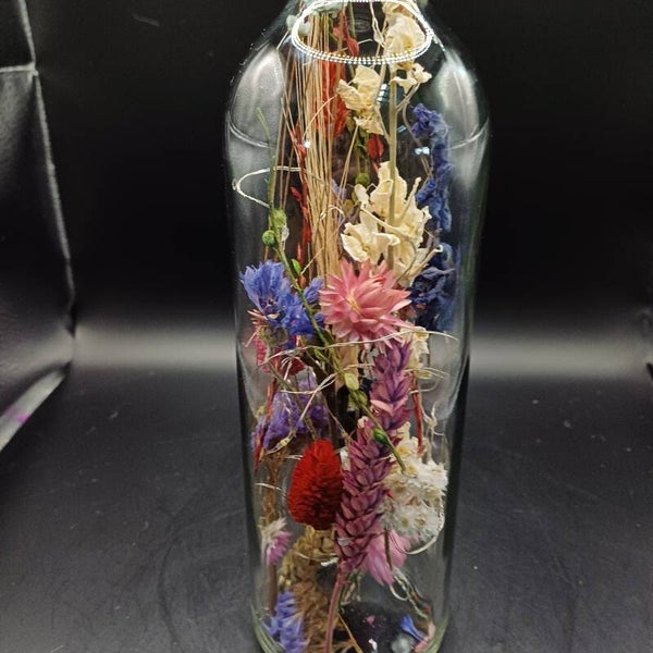 1 Magische fles met ledverlichting in de fles en droogbloemen.