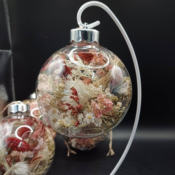 Transparante kerstbal van kunstof met droogbloemen excl. houder.